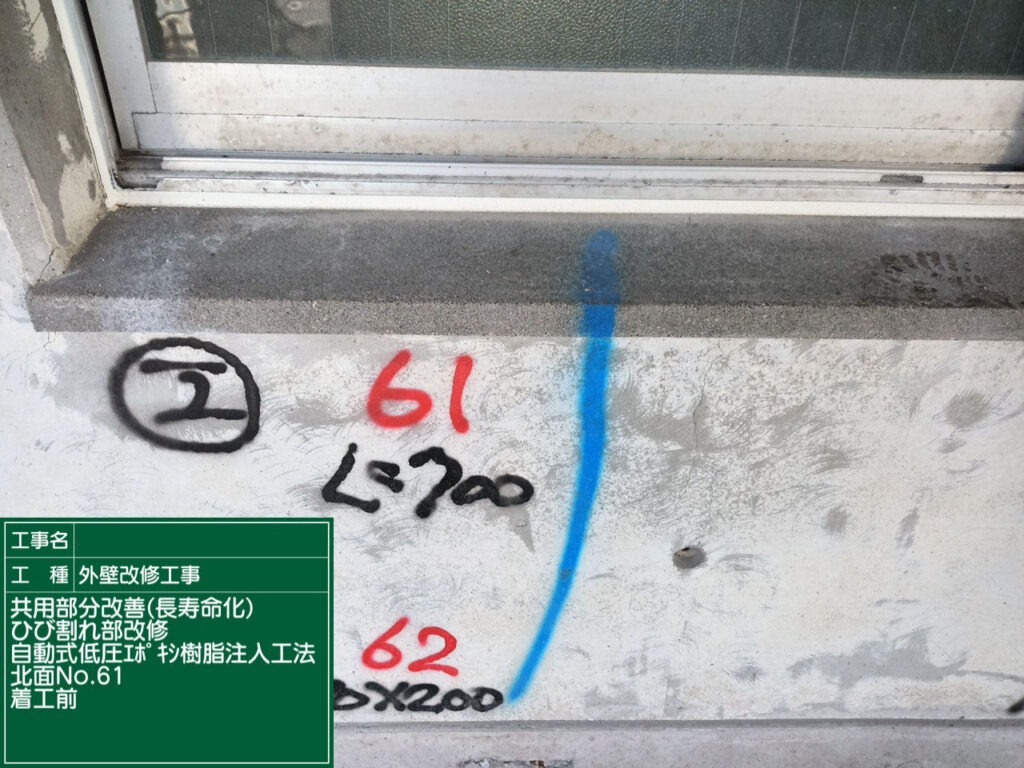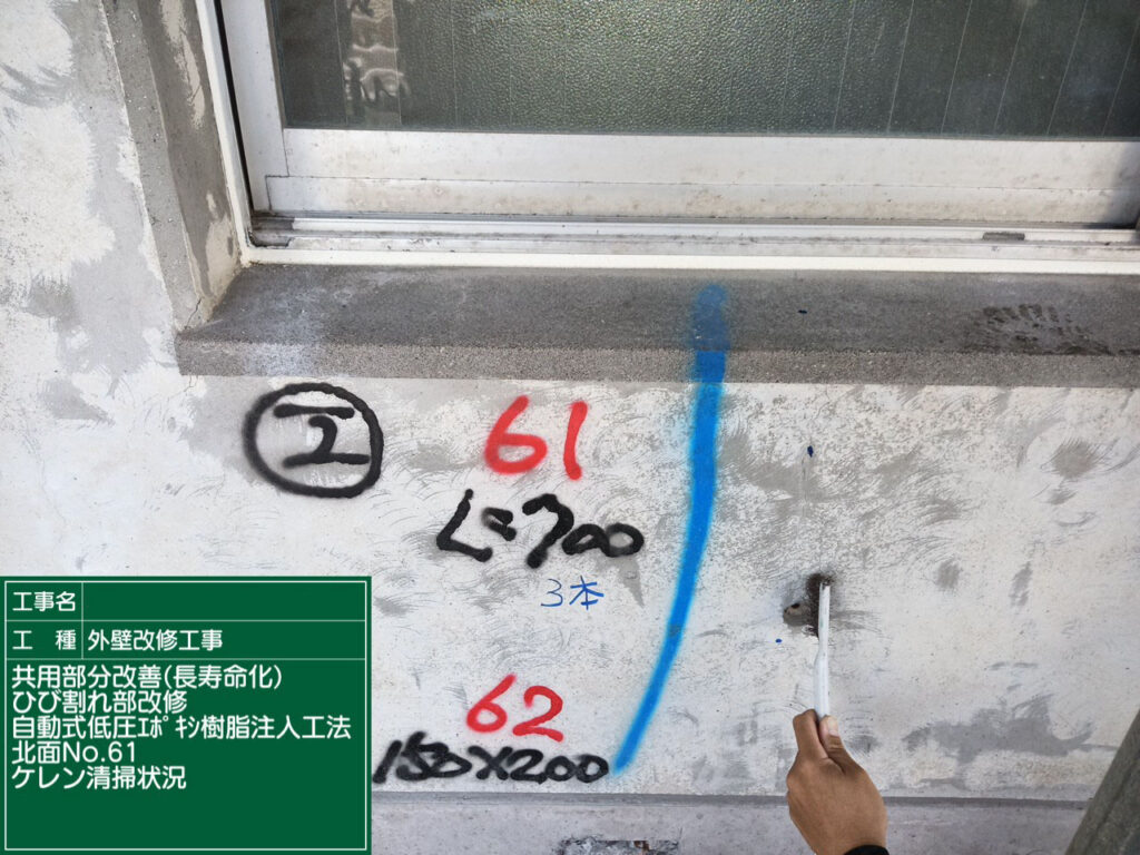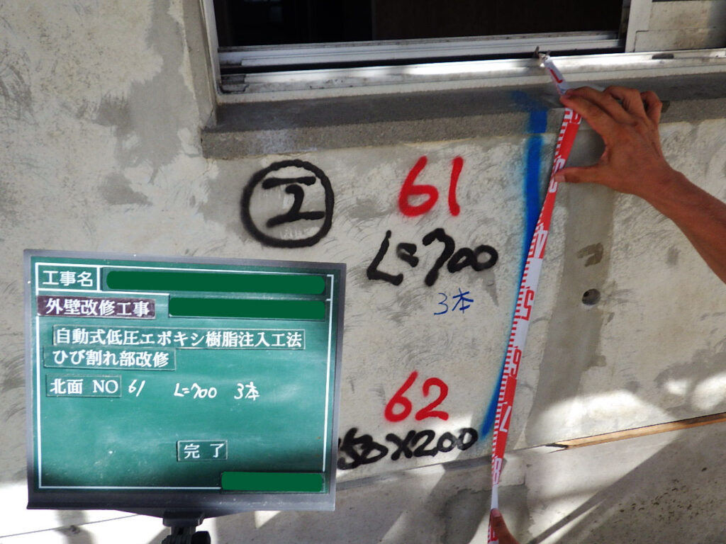 ひび割れの位置・幅・長さを確認し、施工範囲を明確にします。