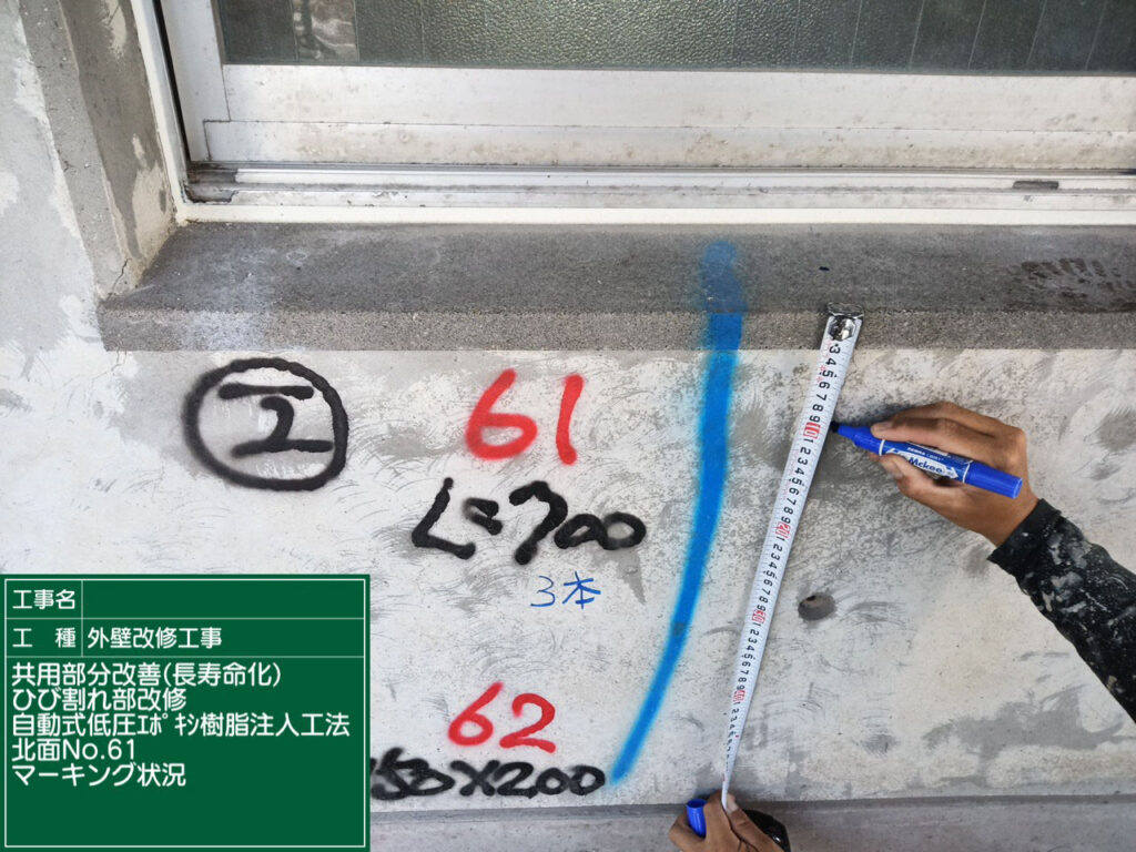 補修箇所を明確にするため、ひび割れ部分にマーキングを行います。