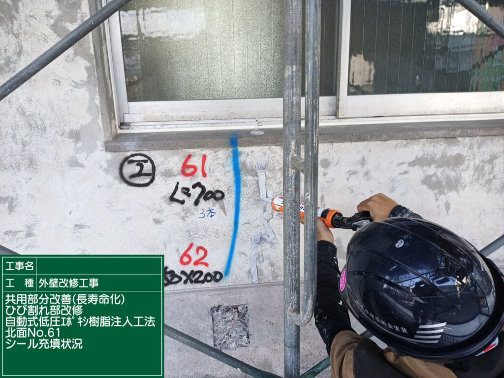 ひび割れ部分をシール材で密閉し、樹脂が漏れないようにします。し、耐久性を高めます。